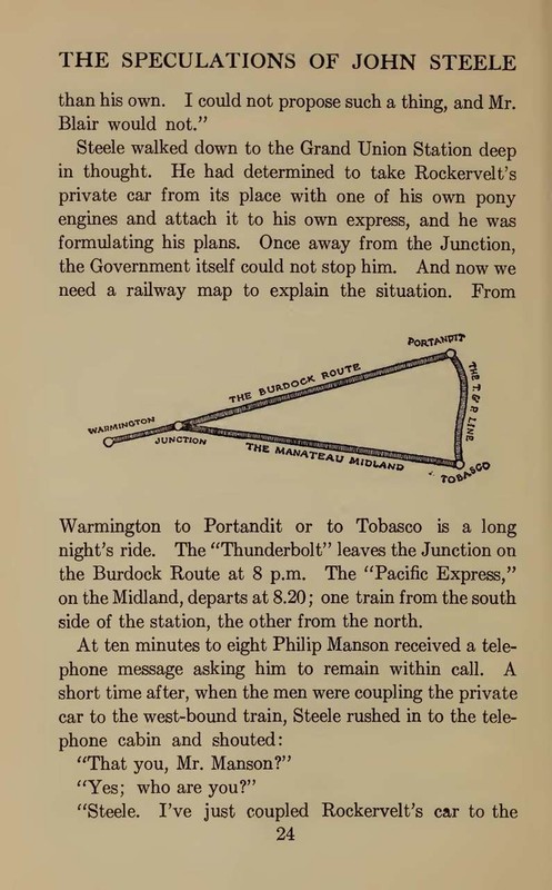 But there was one man who did not like John, and that was no less important a personage than the general manager himself. His huge room in the lower part of the tower was as sumptuously furnished as an eastern palace. T. Acton Blair, general manager of the Manateau Midland, was supposed to be related to the Rockervelt family, but this was perhaps a fallacy put forth to account for the placing of such a palpably incompetent man in so responsible a position. He was a bald-headed, corpulent personage, pompous and ponderous, slow moving and slow speaking, saying perfectly obvious things in a deep, impressive voice, as if he were uttering the wisdom of ages. His subordinate, Philip Manson, as everybody knew, was responsible for the efficiency of the road; and when he wanted a project carried out, he always pretended it was Blair’s original idea, so the general manager got the credit if it was a success, and Manson shouldered the blame if it was not.