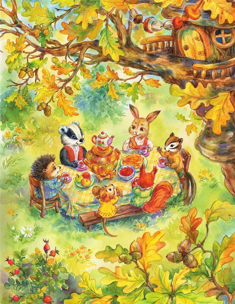 Зайка Лёля пригласила мышку Соню к себе в домик, который располагался у подножия большого дуба, варить варенье из яблок. А вечером все собрались за столом в центре поляны и стали пить чай из самовара.
