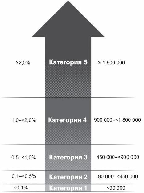 Индекс построен на манер Шкалы ураганов, отражающей силу и разрушения, нанесенные стихией, давая возможность ЦКЗ классифицировать смертоносную силу различных пандемий.141 В основе графика (рис. 1) лежит уровень летальности и процент заболевших, которые в итоге потенциально станут жертвами инфекции. Так, во время самой губительной пандемии в истории – испанского гриппа 1918 года, заболел каждый третий, из которых умерло 2 %.142, 143 Таким образом, пандемии 1918 года была присвоена 5-я категория тяжести, аналогичная «катастрофическому» уровню Шкалы ураганов Саффира – Симпсона, называемому также супертайфуном, когда постоянная скорость ветра в буре превышает 70 м/с.144 Уровень смертности от COVID-19 куда ниже и близится примерно к 0,5 % – исходя как из актуальных данных по регионам, выполнившим наибольшее количество тестов,145–147 так и из анализа исторических тенденций развития пандемий, применяющегося для расчетов в реальном времени.148