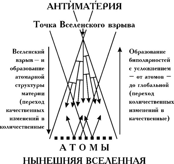 Посмотрим на наш рисунок. Если наше допущение верно, и наша нынешняя Вселенная — один из полюсов биполярной конструкции МАТЕРИЯ (1) — АНТИМАТЕРИЯ (2), то что является образующая данную БК среда? ЧТО ЭТО ТАКОЕ? Смотрим на рисунок. Это остатки некоей первосреды, давшей начало БК: Первоматерия-Перводух (на рисунке мы назвали ее условно СРЕДА ПЕРВОСУТИ); но и до нашей Вселенной образовывались некии (кроме вышеуказанной) биполярные конструкции, которые не исчезли бесследно; они явились основой образования нисходящих по уровню сложности БК — вплоть до нынешней нашей Вселенной. Согласно нашей теории, БК предыдущие входят составной частью в БК последующие — образования более высокого уровня. Но предшествующий процесс согласно схемы стр.19, идет в двух встречных направлениях — по пути упрощения и по пути усложнения многочисленных БК. Вот этот рисунок: