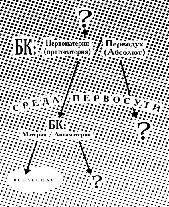 А ведь мы даже представления не имеем, как разделялась Первосуть (и что, собственно, это такое с точки зрения состояния и строения пространства и его частей), далее — что за триединая БК образовалась в результате. Почему, собственно, мы считаем, что полюса в дальнейшем разделении — это Первоматерия и Абсолют? Не подразумеваем ли мы тем самым, что некогда ГДЕ-ТО, КОГДА-ТО была некая биполярная конструкция, подобная нынешней Вселенной, и именно она лежит в истоках образования нашей Вселенной именно в таком виде, какой она имеет.