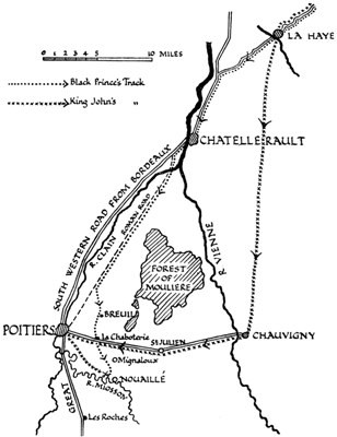 It was the Black Prince’s business to get down on to the great road which has been the trunk road of Western France for two thousand years, and which leads from Paris through Châtellerault and Poitiers to Angoulême, and so to Bordeaux. If (as he hoped) he could advance so quickly as to get rid of the pursuit, so much the better. If he were still pressed he must continue his rapid marching, but, at any rate, that was the road he must take.