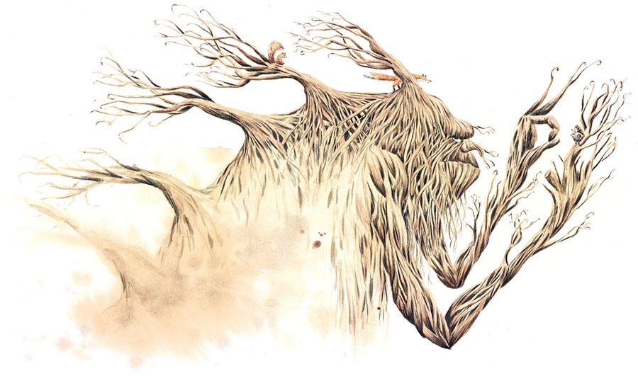 Когда к их жилищу пришёл дух леса, они спрятались на большом каштане, думая, что там-то они в безопасности.