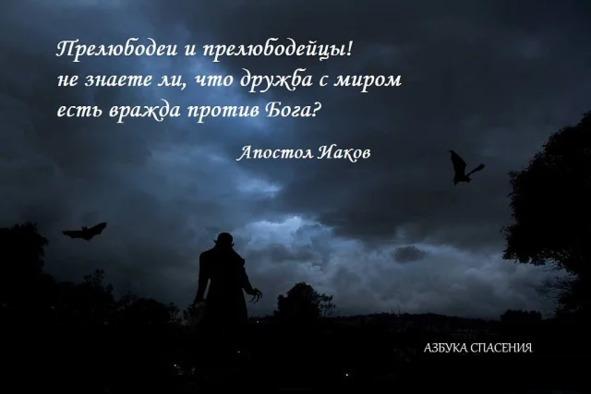 Прелюбодее и прелюбодейцы! не весте ли, яко любы мира сего вражда Богу есть? иже бо восхощет друг быти миру, враг Божий бывает. Блаженный Феофилакт Болгарский определяет мир так: Обычно Писанию называть миром житие грешных и пребывающих в нем людей плотского мудрования, почему и Христос сказал ученикам Своим: вы несте от мира. Они составляли часть живущих в мире человеков, но, не пребывая в грехе, не были от мира. Большинство человеков проводило и проводит жизнь греховную, мерзостную пред Богом, враждебную Богу: по этой причине и потому, что большинство врагов Божиих несоразмерно велико в сравнении с числом верных служителей Бога, большинство называется в Писании миром; относящееся к большинству приписывается всему человечеству.