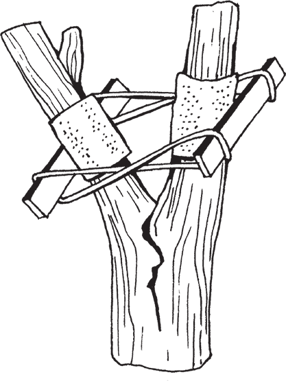 Хотя в саду еще кое-где лежит снег, пора приступать к первым весенним работам. В теплые мартовские дни можно начать обрезку плодовых деревьев. Важно не упустить время и закончить ее до начала набухания почек. Вооружитесь остро заточенными садовыми пилками, ножами, секатором на шесте и начинайте прореживать загущенные кроны деревьев, вырезая в первую очередь сухие, подмерзшие, лишние и больные ветви. В конце месяца следует продолжить работу по формированию крон молодых деревьев. Ветви обрезайте правильно, не оставляя пеньков и избегая нанесения больших ран. Все повреждения после обрезки обработайте садовым варом или закрасьте масляной краской на натуральной олифе. Для удобства используйте легкую, устойчивую переносную лестницу, чтобы не лазать по деревьям, не вставать на ветви и случайным образом не повредить кору. Если вы обнаружите расщепленные ветви, постарайтесь прочно скрепить их – привязать к штамбу или соединить между собой (рис. 1). Кроме того, таким ветвям нужны подпоры с земли.