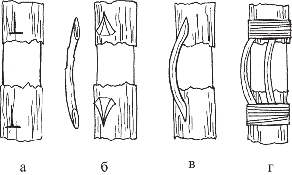 Рис. 4. Прививка «мостиком»: а – подготовка дерева к прививке; б – отгибание коры; в – прививка; г – обвязка