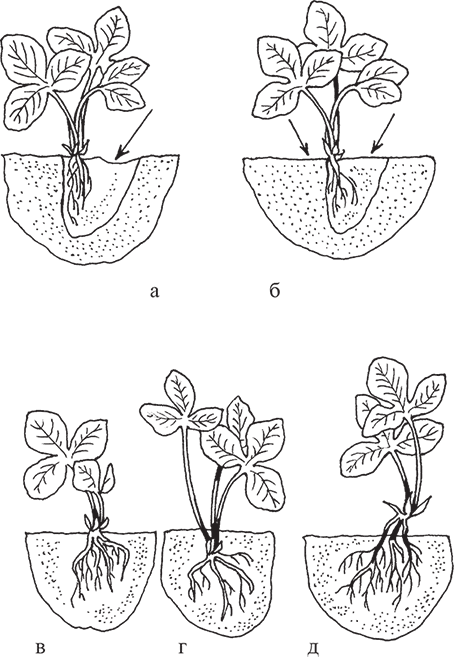 Рис. 3. Процесс посадки кустиков клубники: а – распределение корней в лунке и присыпание их землей; б – уплотнение почвы вокруг корней; в – правильная посадка; г, д – неправильная посадка