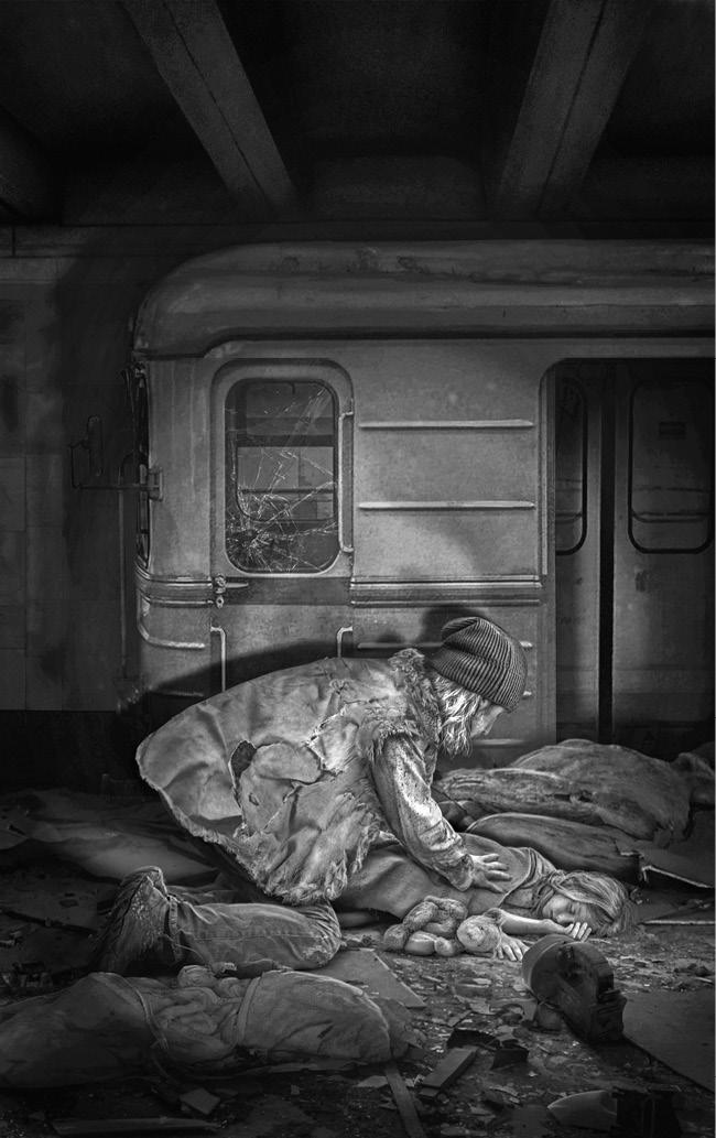 Выжить в этом аду было нельзя. Но я не хотел этого понимать — и бежал! Это был непрерывный, непрекращавшийся бег. Бежавшие рядом падали в бездонные ямы и широкие провалы — и сгорали, не успев достичь дна. На оплавленных и переломанных стенах виднелись контуры фигур — следы человеческих тел — там, где их настигла вспышка от взрыва. Люди, обезумевшие и озверевшие, рвали друг друга на куски, чтобы выбраться, вылезти первыми из этого кошмара.