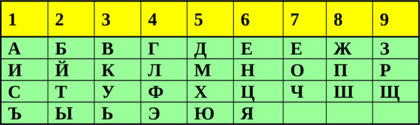 И начнём мы с самого главного — слово «цель». Рассчитаем это слово, опираясь на русский алфавит. Ниже представлена таблица, в которой каждой букве соответствует числовое значение.