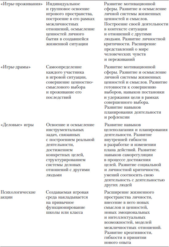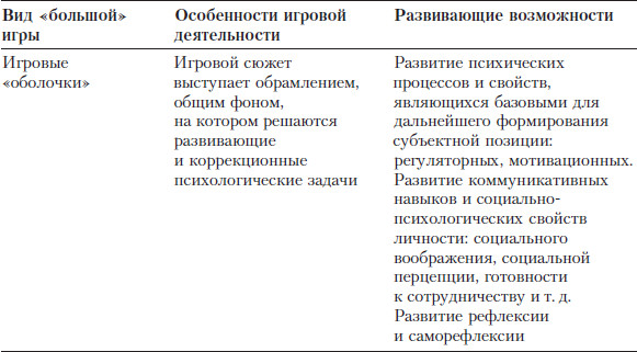 Ниже в таблице представлены все виды «больших» игр с точки зрения их особенностей и развивающих возможностей (прежде всего – с точки зрения развития субъектной позиции ребенка и подростка).