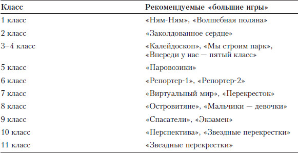 Есть целый ряд «больших» игр, которые, на наш взгляд, обладают развивающими возможностями, важными для того или иного возрастного периода. Поэтому мы из года в год планируем и проводим их в определенных школьных параллелях. Это такие игры, как «Репор-тер-1» и «Репортер-2» в параллели шестых классов, «Виртуальный мир» – в седьмых, «Мы строим парк», «Калейдоскоп» и «Впереди у нас – пятый класс» – в выпускном классе начальной школы. Вместе с тем есть игры, которые мы используем выборочно, внимательно анализируя ситуацию в коллективе, состав детей, отношения с классным руководителем. К ним относятся «Перекрестки», «Островитяне», «Заколдованное сердце».