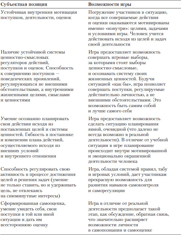 По мнению Н. Клюевой, в субъектно-деятельностном подходе ребенок рассматривается как самостоятельный, уникальный человек, который строит собственную систему знаний и ценностей на основе опыта событийных встреч с окружающими людьми и культурой. «Большая» игра – это жанр психологической работы, который прекрасно сочетается с субъектным подходом к пониманию сущности человека. Ниже, в таблице, представлены результаты соотнесения различных аспектов субъектной позиции и возможностей игры как деятельности.