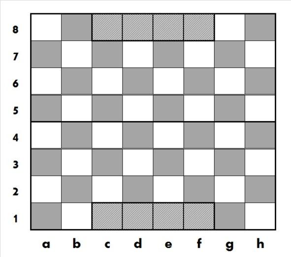 Игра chess-Т1 происходит на черно-белом клеточном игровом поле 8х8, состоящим из 64 клеток. Оно почти совпадает с шахматной доской (см. рис. 1.1), но имеет одно отличие. Четыре клетки в центре первой горизонтали и четыре клетки последней горизонтали имеют не черно-белую, а однотонную окраску, в данной монографии — серую со штриховкой. Группы из эти особых четырех клеток у каждой из противоборствующих сторон представляют их королевские замки или крепости (в дальнейшем будет употребляться сокращенное наименование — замки). Значение замков в игре раскрывается далее по тексту.
