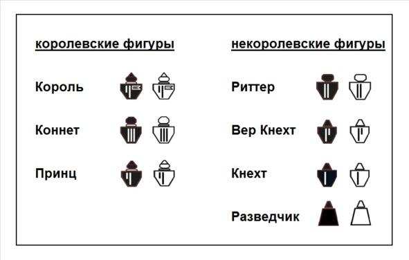Каждая сторона в начале игры (партии) chess-Т1 имеет в своем распоряжении «войско», состоящее из одинакового набора фигур: Король, Коннет (сокращение от слова Коннетабль, в средневековой Франции Коннетабль это высший военный чин), два Принца, два Риттера (конных Рыцаря), восемь Кнехтов (пеших воинов, пехотинцев) и два Разведчика (конных Разведчика). По ходу игры (см. далее, глава 2. Правила ходов (подвижность) фигур. Превращения фигур) на доске может появиться еще один вид фигур — Вер Кнехт (очень опытный пеший воин). Король, Коннет и Принц являются, так называемыми, королевскими фигурами, далее будут показаны их особенные свойства, по сравнению с другими фигурами.