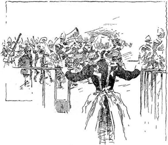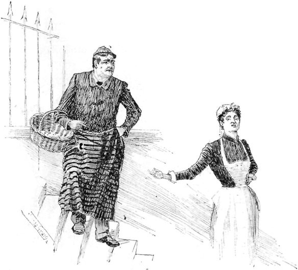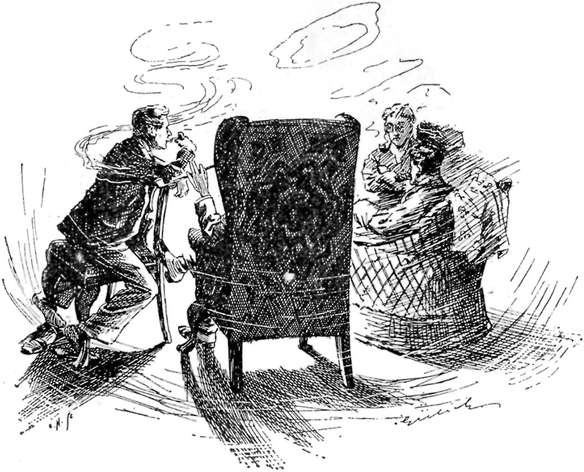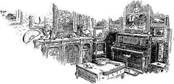 And so the sketch runs on, until, in speaking of the universal manner in which music is appreciated in England by all classes, Mr. Grossmith goes on to say: "We have made rapid strides, so have our servants. They don't know how to dust the piano, but they can play it. Everybody plays the piano, from the Peerage to the School Board. Then look how music has crept into our homes and social circles. Besides the piano, the mother and daughters play the banjo, the son plays the first fiddle, and the father the second fiddle—as usual. I know of a Lord Mayor who plays the trombone, a clergyman who plays the big drum—that's a nice unpretentious, giddy instrument!—and I know of any number of members of Parliament who blow their own trumpets!!" And so the notes go brightly on through many pages.