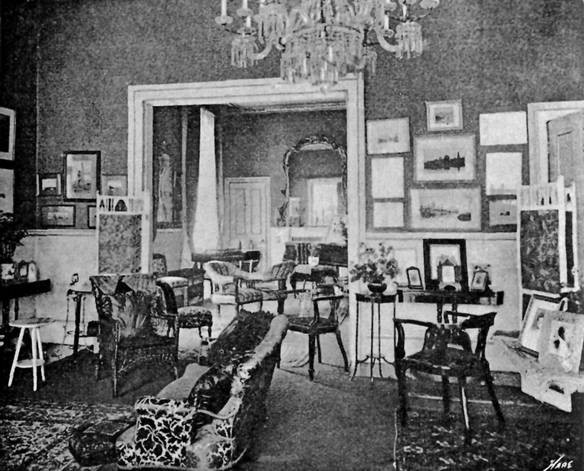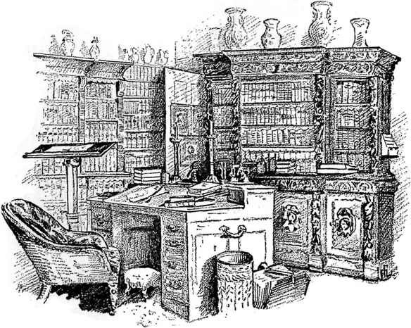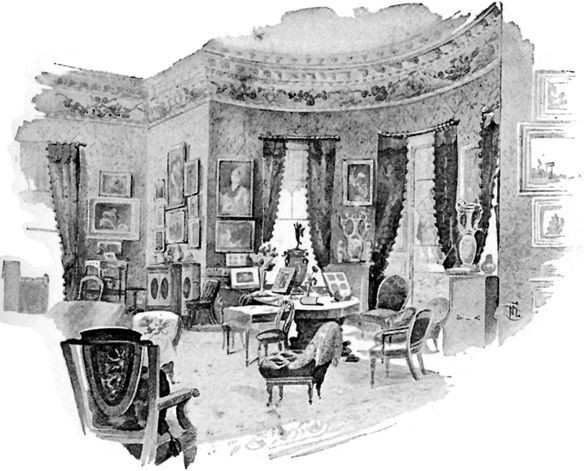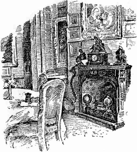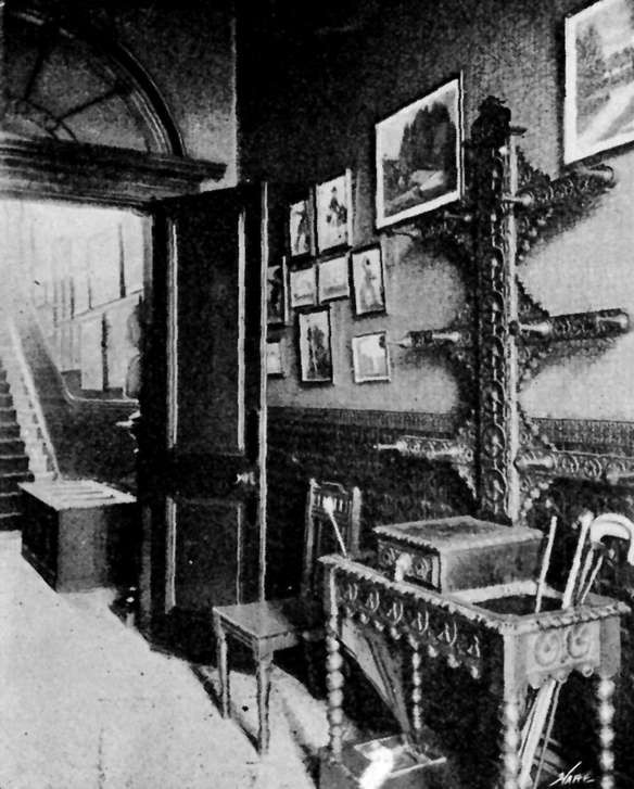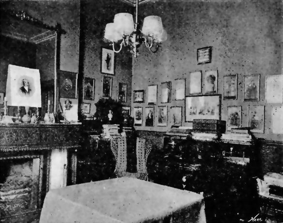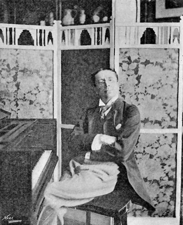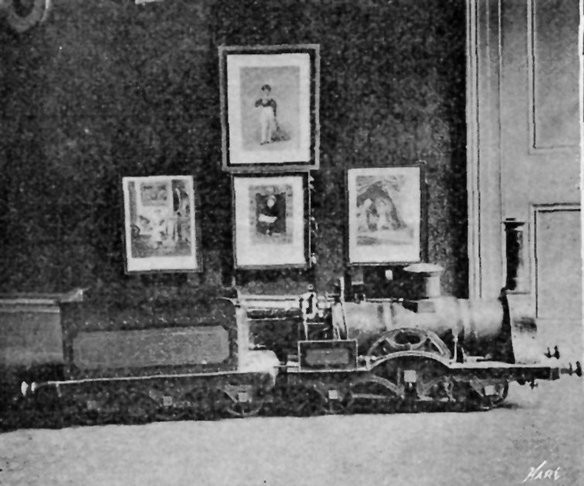 As he said this Mr. Grossmith led the way out of the room in which we had been talking, and which he told me was his own special sanctum, "into which no one is ever allowed to come except my wife, for anyone rushing in here when I was composing or thinking out a sketch would inevitably drive every single idea from my head," and we went upstairs together. Here in the drawing-room he set himself down to a spinet which bore the date of 1770, and he struck a few exceedingly sweet-sounding, if slightly tinkling, chords from it. "And this," said he, "is the oldest Broadwood in England. You can see for yourself the date—1795." Downstairs he showed me a beautiful model of a steam engine, upon which he was enabled to ride, and which he could drive himself. "I thoroughly understand locomotives," said he, as he pointed to a shelf full of all the works upon the subject which he had been able to discover.
