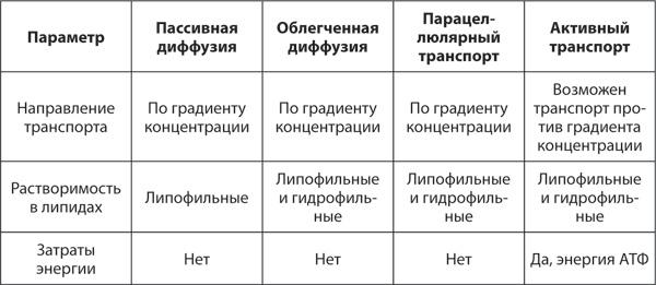 1. Пассивная (простая) диффузия (трансцеллюлярный транспорт). При этом виде всасывания ЛС движется по градиенту из области высокой концентрации лекарства (просвет кишечника, место инъекции) в область с низкой концентрацией (плазма крови). Для того чтобы абсорбироваться, ЛС должно пройти липидные мембраны клетки, растворившись в них. Это возможно только для небольших липофильных, но не гидрофильных веществ (рис. 1). Пассивная диффузия не требует затрат энергии. Этот механизм абсорбции характерен для кишечника, сосудов головного мозга.
