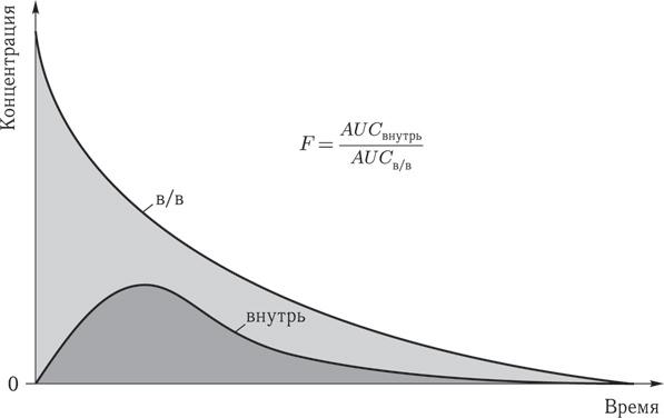 Используя временной показатель, можно рассчитать площадь под кривой (AUC) на графике зависимости концентрации от времени. Отношение (AUC перорально /AUC в\в) x 100 позволяет определить биодоступность (f).