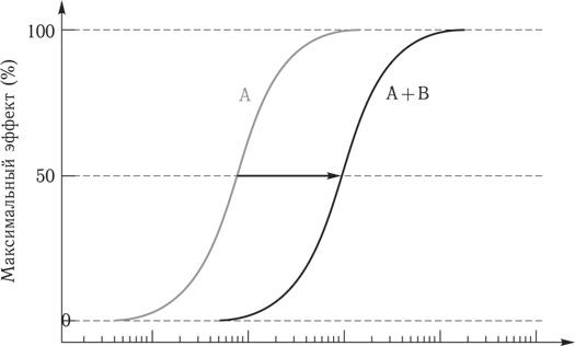 Рис. 4. Образование комплекса лекарство – рецептор приводит к биологической реакции. Величина ответа пропорциональна количеству комплексов лекарство – рецептор. Обычный способ представления взаимосвязи между концентрацией лекарственного средства и биологической реакцией – это кривая «доза (концентрация) – эффект». Пример конкурентного антагонизма. Агонист А вызывает определенный эффект. Если он вводится на фоне антагониста (В), то прежний 100 % эффект достигается в большей концентрации