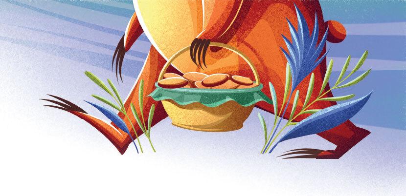 Оставшись на кухне одна, девочка забралась в кузовок, укрылась полотенцем, сверху положила пирожки, и стало её совсем не видно.