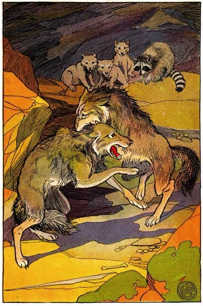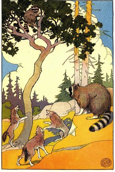 “He’s a friend of the wolves!” shouted the one from the branches of the tree. “Don’t believe him! He came here with a wolf, and he said the wolf was his friend. Therefore, he’s no friend of the raccoons.”