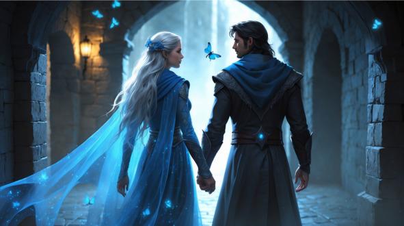 Мрачные стены древнего замка, казалось, дышали в такт шагам двух фигур, скользящих по тайному коридору. Синие светлячки, словно живые сапфиры, вились по камням, вспыхивая ярче при каждом прикосновении серебровласой девушки. Они узнавали её — последнюю из Хранителей Истока.
