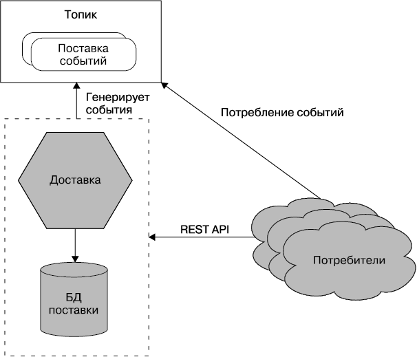 Рис. 1.1. Микросервис, предоставляющий свои функциональные возможности через REST API и топик