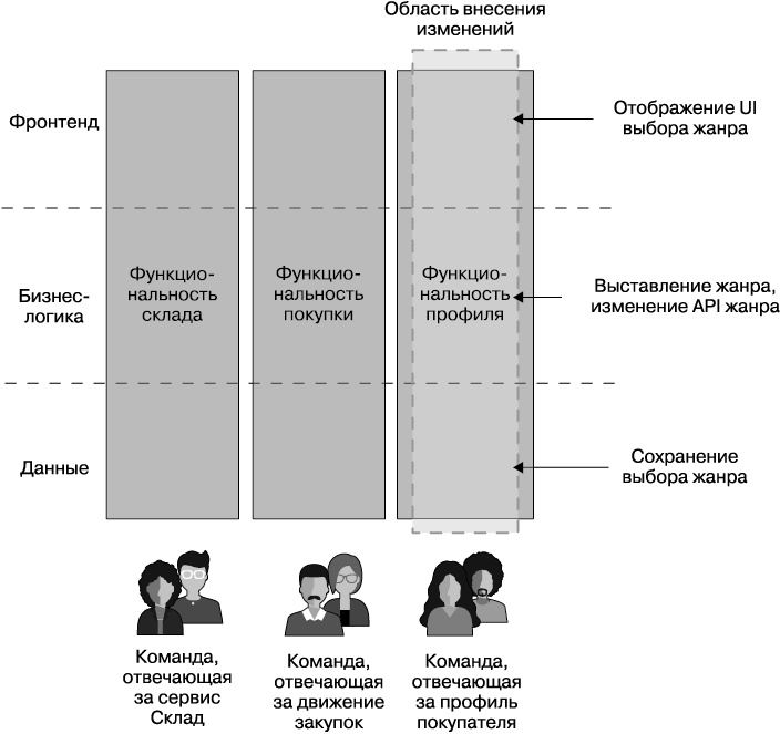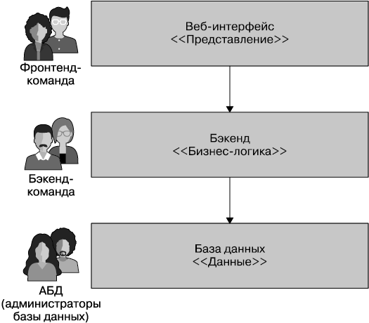 Я часто вижу многоуровневые архитектуры, типичный пример которых представлен на рис. 1.2. Здесь каждый уровень определяет отдельную границу обслуживания, причем каждая из них относится к соответствующей технической функциональности. Если бы в этом примере я вносил изменения только в уровень представления, это было бы довольно эффективно. Однако опыт показывает, что изменения в функциональности обычно охватывают несколько уровней, что требует изменений в представлении, приложениях и уровне данных. Эта проблема усугубляется, если архитектура еще более многоуровневая, чем в простом примере на рис. 1.2. Часто каждый уровень разбит на дополнительные слои.