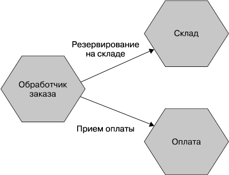 На рис. 2.2 показана часть того, как заказы на компакт-диски управляются внутри MusicCorp. В этом примере Обработчик заказа вызывает микросервис Склад для резервирования на складе, а микросервис Оплата принимает оплату. Следовательно, Обработчик заказа в этой операции зависит от микросервисов Склад и Оплата и связан с ними. Между сервисами Склад и Оплата нет такой связи, поскольку они не взаимодействуют.
