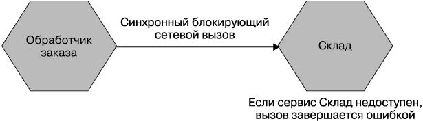 Рис. 2.3. Пример временной связи, при которой Обработчик заказов выполняет синхронный HTTP-вызов микросервиса Склад Если по какой-либо причине Обработчик заказов не может связаться со складом, операция завершается ошибкой, так как не получается зарезервировать компакт-диски для отправки. Сервису Обработчик заказов также придется выполнять блокировку и ждать ответа от сервиса Склад, что может вызвать проблемы с точки зрения конкуренции за ресурсы. Это не значит, что временная связь плоха. Просто об этом следует знать. По мере роста количества микросервисов с более сложными взаимодействиями проблемы временной связанности могут возрасти до такой степени, что становится все труднее масштабировать систему и поддерживать ее работоспособность. Один из способов избежать временной связанности — использовать некоторую форму асинхронной связи, такую как брокер сообщений. |