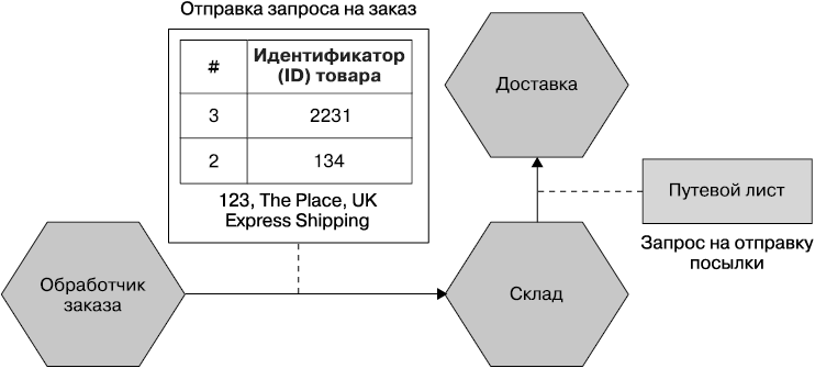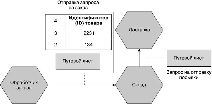 В качестве примера сквозной связи более внимательно рассмотрим фрагмент системы обработки заказов MusicCorp. На рис. 2.4 показан Обработчик заказов, посылающий запрос к сервису Склад для подготовки заказа к отправке. В качестве полезной нагрузки запроса мы отправляем Путевой лист. Этот Путевой лист содержит не только адрес клиента, но и тип доставки. Сервис Склад просто передает эту информацию нижестоящему микросервису Доставка.