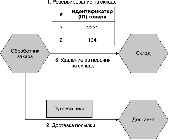 Проблема этого конкретного примера в том, что и Склад, и Обработчик заказов разделяют ответственность за управление этим конечным автоматом. Как мы можем быть уверены, что они согласуют допустимые переходы? Существуют способы управления подобными процессами через границы микросервиса; мы вернемся к этой теме, когда будем обсуждать саги в главе 6.