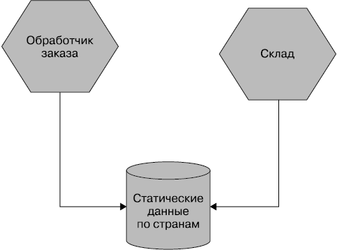 Пример на рис. 2.7, условно говоря, довольно безобидный. Это связано с тем, что по самой своей природе справочные данные нечасто меняются, а также потому, что они доступны только для чтения. Поэтому я спокойно отношусь к совместному использованию справочных данных таким образом. Однако общая связанность становится более проблематичной, если структура данных меняется чаще или если несколько микросервисов читают и записывают одни и те же данные.