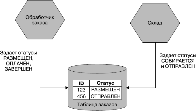 На рис. 2.8 показана ситуация, в которой сервисы Обработчик заказов и Склад считывают и записывают данные из общей таблицы Заказ, чтобы помочь управлять процессом отправки компакт-дисков клиентам MusicCorp. Оба микросервиса обновляют столбец Статус. Обработчик заказов может задать статусы РАЗМЕЩЕН, ОПЛАЧЕН и ЗАВЕРШЕН, в то время как Склад задает статусы СОБИРАЕТСЯ или ОТПРАВЛЕН.