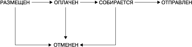 Гарантией того, что состояние чего-либо изменяется правильным образом, было бы создание конечного автомата. Конечный автомат может использоваться для управления переходом некоторого объекта из одного состояния в другое, запрещая недопустимые переходы состояний. На рис. 2.9 можно увидеть разрешенные переходы состояний для заказа в MusicCorp. Заказ может перейти непосредственно из статуса РАЗМЕЩЕН в статус ОПЛАЧЕН, но не напрямую из статуса РАЗМЕЩЕН к СОБИРАЕТСЯ (этого конечного автомата, скорее всего, будет недостаточно для реальных бизнес-процессов, выполняемых при покупке и доставке товаров, но смысл этого простого примера — проиллюстрировать идею).