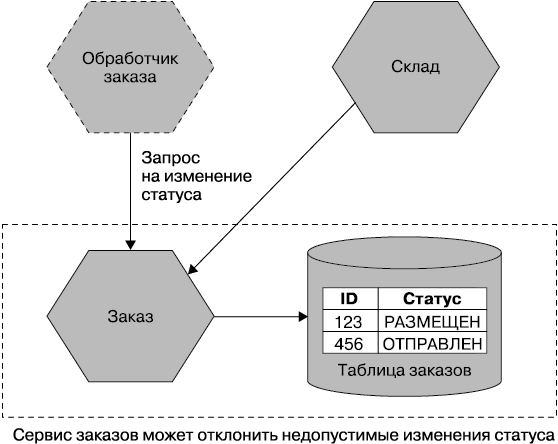 Рис. 2.10. Сервисы Обработчик заказов и Склад могут выполнить запрос на изменения в заказе, но решение о том, какие запросы допустимы, принимает микросервис Заказ