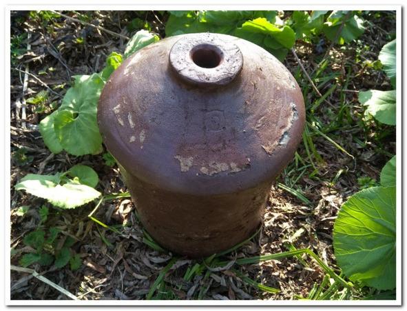 Ручей резко раздался и показалась поляна, как и обещано, еще не заросшая. Кроме того она оказалась заваленной многочисленными артефактами. Когда-то здесь был какой-то человеческий пункт с лопатами, странными металлическими огромными кольцами, подковами и еще каким-то древним хламом. А чуть дальше мы нашли под кустом, лежащую на боку древнюю амфору. Это была японская керамическая бутыль, с дыркой в самом низу. Видимо для сакэ. (подсказали что для соевого соуса) Дырка снизу затыкалась и растыкалась, когда нужно было слить нужное количество жизненнонеобходимой влаги. Бутыль была на редкость прекрасной сохранности, объемом она литров 12. В общем мы продаем ее. 100 тыс, самовывоз.