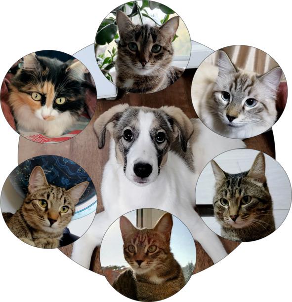 Дома у нас живут шесть кошек и собака. Кошачья семья создавалась постепенно — сначала появилась Раска, пушистая трёхцветная красавица кошка. Через определённое время у неё появился котёнок, Тиша.
