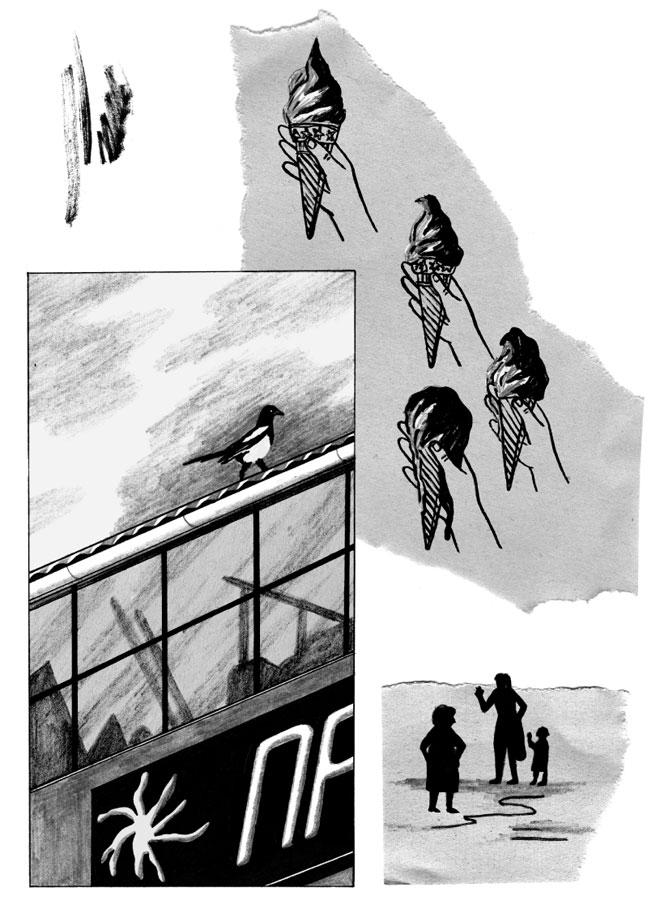 Тогда я оторвалась от сороки и подняла глаза, а она показывает на мою руку, в которой я все еще держу мороженое: оно уже совсем растаяло и стекает по руке, капает на платье или в чем я там была, на землю. Видимо, я сама не заметила, как долго наблюдала за птицей.