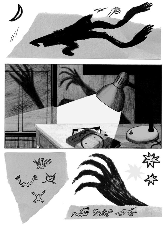 Иногда я так сильно боюсь, что не могу даже встать, потому что под кроватью, где, само собой, чернота, может укрываться нечто и оно схватит меня за ногу, как только я спущу ее вниз. А бывает, что я больше боюсь не того монстра, который живет под кроватью, а кого-нибудь другого, тогда можно вскочить и пулей добежать до спальни родителей. Правда, это совсем не по душе папе, потому ему тогда приходится переходить в мою комнату, а на моей кровати у него болит спина, видите ли. Но я обычно не обращаю на это внимания, потому что лежать и не спать один в своей комнате я просто не могу.