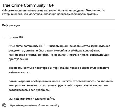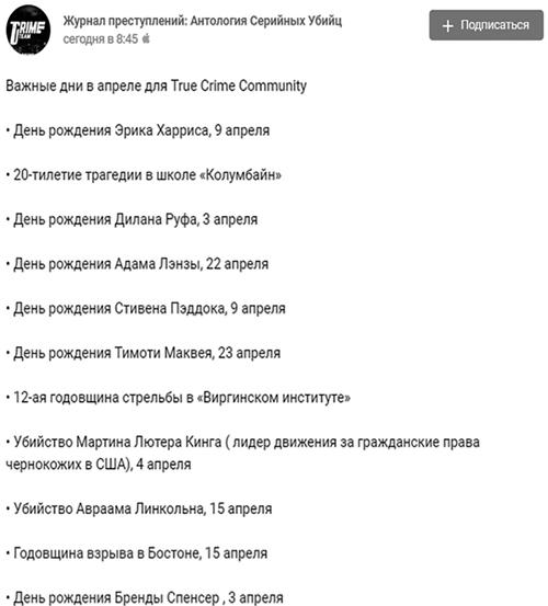 Одной из основных воронок вовлечения в сообщества колумбайновской, МКУ- и иной радикальной направленности выступает так называемое True Crime Community (TCC, тру-крайм коммьюнити) — сообщества «настоящих» преступлений (рис. 10, 11, 12), т. е. в понимании последователей данной субкультуры преступлений, мотивированных не корыстными, бытовыми и т. п. мотивами, а желанием убивать как таковым.