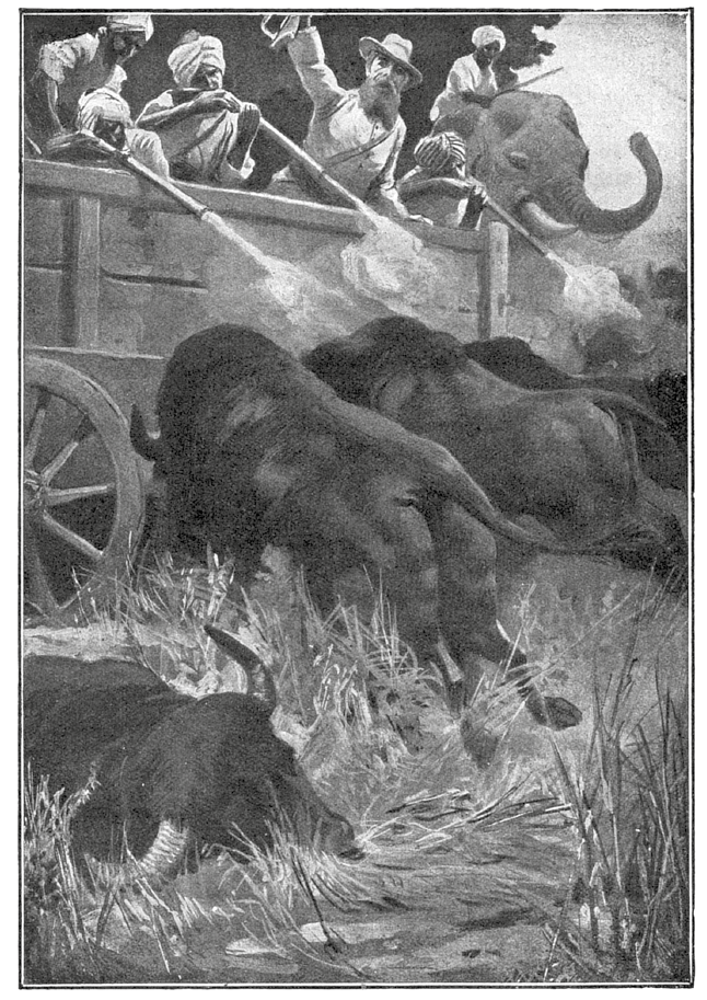Над джунглями прокатилось слитное эхо восьми выстрелов. Еще три буйвола упали, но остальные и не подумали останавливаться. С диким мычанием они, точно бешеные, уже почти добежали до повозки, когда из кустов неожиданно возник ревущий слон, на спине которого сидел полуголый корнак-индус.
