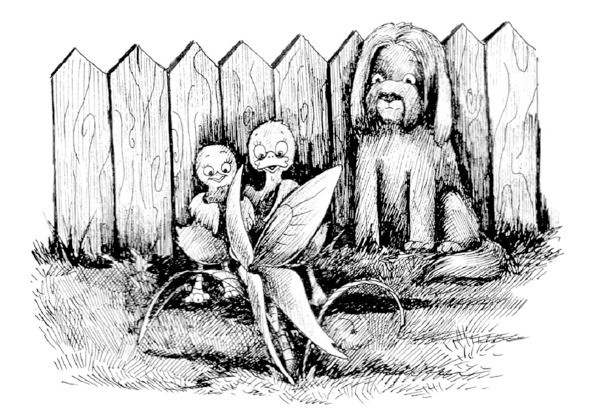 Сторожевой пёс поднял глаза кверху. Цыплёнок и утёнок тоже посмотрели вверх, но ничего там не увидели, кроме бабочек.