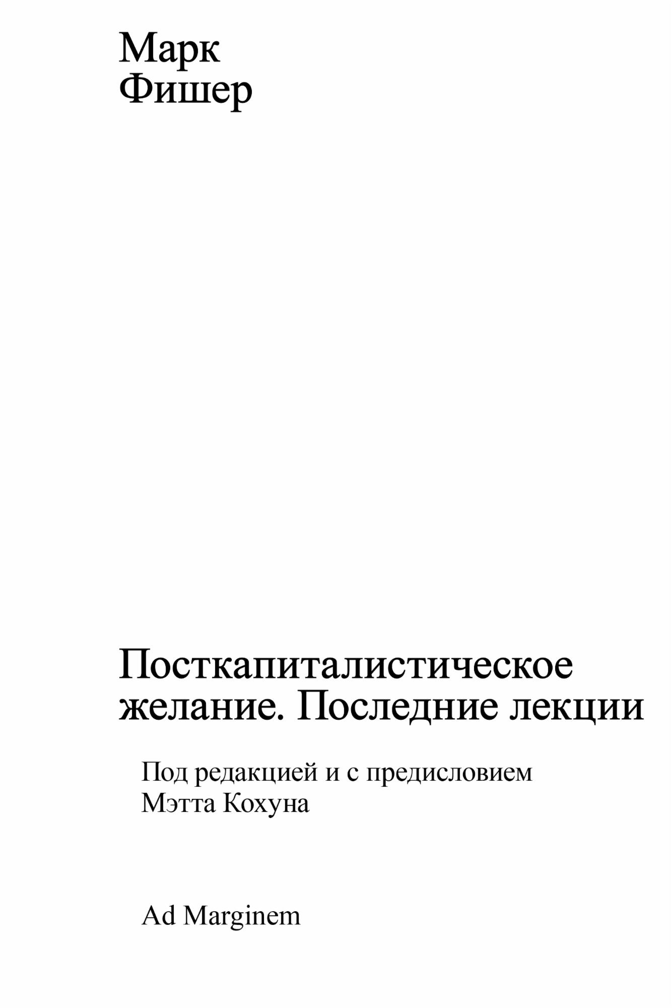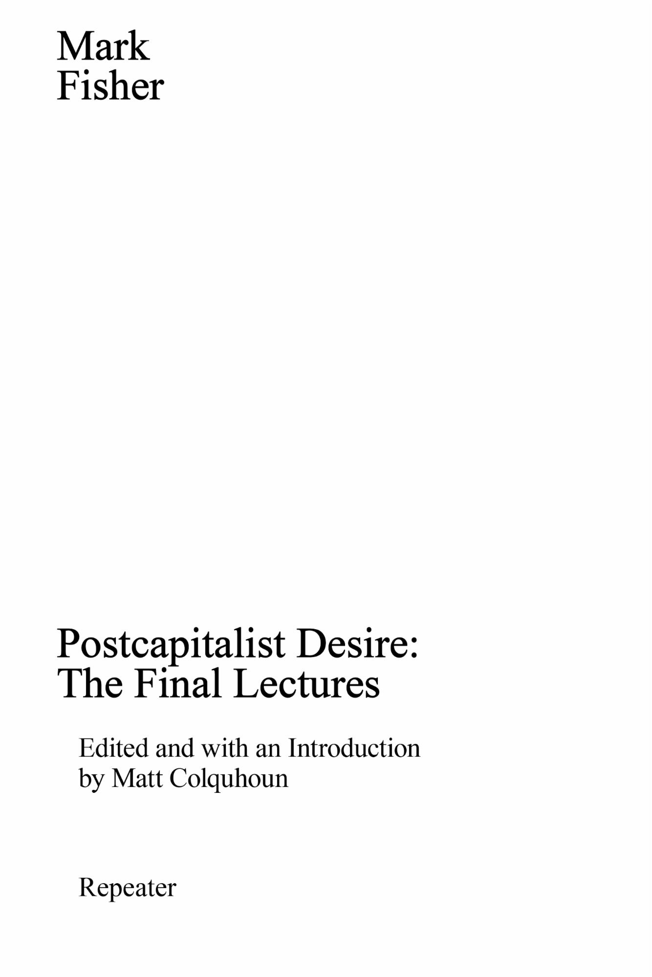 Это действие не так спекулятивно, каким может показаться сначала. Наряду с пестрым собранием эссе Фишера, созданных на всем протяжении его пути писателя и критика и отражающих многие темы и предметы, к которым он еще надеялся подступиться, у нас есть план его последнего курса, частично прочитанного магистрантам Голдсмитского колледжа в Лондоне в 2016 году, — Посткапиталистическое желание.