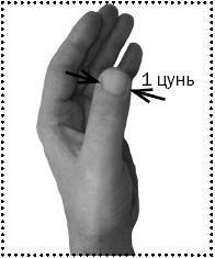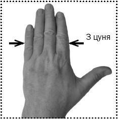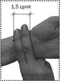 На атласах активные точки наносятся с соблюдением этого самого индивидуального цуня – не сантиметра, не вершка, а величины ногтевого ложа нашего с вами большого пальца. Если большой палец какой-либо руки слишком хорошо развит в силу рода занятий (в старину такое случалось с левым пальцем у прях, тянущих из кудели нить), используйте для пропорций менее развитый палец – он надежней сохраняет природные пропорции. На фото 2, а показано, каким участком большого пальца отмеряют 1 цунь. А четыре пальца, сложенных вместе, составляют 3 цуня (фото 2, б). Указательный и средний палец в сумме дают 1,5 цуня (фото 2, в).