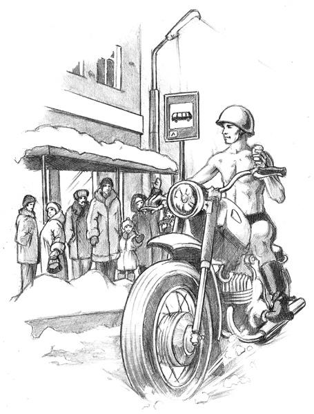 Из-за угла, мимо них, тожественно и важно на мотоцикле выезжает Серега. На нем из одежды – хромовые сапоги, трусы и каска. Он уверенно правой рукой управляет мотоциклом, в левой – мороженое.