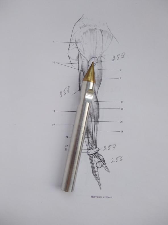 Вплив масажером, спокійно сприймається тілом. Електричний заряд, за допомогою якого проникає у тіло, стимулює організм. Спричинений біль, не травмує нервову систему, тому, що він має електричну потужність тіла. Живий, розумний електричний струм, що виробляється і посилений бажанням самої людини усунути проблему в тілі, виконують свою місію. Кращого лікаря немає, ніж сама людина. Дотик за допомогою думки, бажання, сили волі людини, впливає на тригерну точку і таким чином зникає спазм. Силою розуму, через усвідомлення та імпульс спогаду моменту травми, розривається тимчасова нитка, яка виникла в момент травмування, крізь яку, з тіла в простір, в територіальне місце, де трапилася травма, в той образ болю, який залишився на тому місці, сформувався довгий, сотні кілометрів коридор часу, переходив потенціал життя людини. Весь цей час, нейрони мозку забезпечували життя фантома, залишеного в місці травми, в тому моменті, у фізичному тілі, на підсвідомому рівні. Людина забула про травму, але процеси тривали й формували ланцюг події й порушень в біополі, просторі думки, у просторі часу. При спогаді про те, що трапилося, під час впливу на ущільнення, відбувається усвідомлення себе тут і зараз. Біль тепер і підсвідомий там і тоді, спливає той момент, і в цей момент, людина вилучає з підсвідомості, з території, тимчасовий коридор, через який витікав, потенціал життєвих сил, повертається в тіло. Але, якщо виникає психоемоційна складова, то причину її можна усунути за допомогою Символів. Так відбувається зцілення.