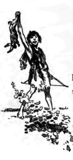 The boy, who led the way, checking the eagerness of his muscles to the slow progress of the elder, likewise wore a single garment—a ragged-edged piece of bear-skin, with a hole in the middle through which he had thrust his head. He could not have been more than twelve years old. Tucked coquettishly over one ear was the freshly severed tail of a pig. In one hand he carried a medium-sized bow and an arrow.