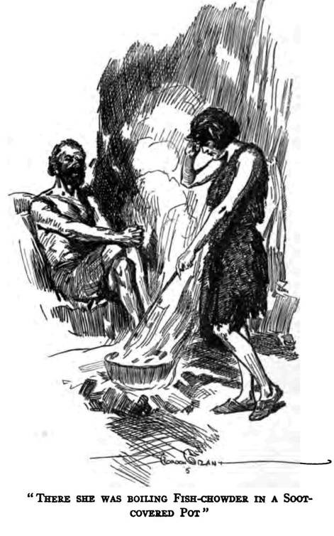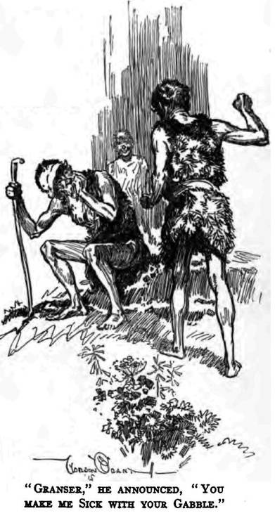 The boys took no notice, and Granser continued to babble an incoherent flow of complaint and censure. But this time he was more careful, and did not burn his mouth. All began to eat, using nothing but their hands and making loud mouth-noises and lip-smackings. The third boy, who was called Hare-Lip, slyly deposited a pinch of sand on a mussel the ancient was carrying to his mouth; and when the grit of it bit into the old fellow's mucous membrane and gums, the laughter was again uproarious. He was unaware that a joke had been played on him, and spluttered and spat until Edwin, relenting, gave him a gourd of fresh water with which to wash out his mouth.