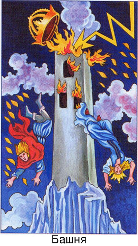 И вот они оба оттуда улетают вниз и, в общем-то, в этот момент сделан стоп-кадр. С Башни слетает Корона (Сахасрара чакра уехала), в Башне горит огонь (избыточная энергия). Сам по себе рисунок сильно отличается от того, что написано в книге Шмакова и если бы мы занимались по ней, то запутались бы очень сильно. Но к счастью, у нас были отличные Учителя, которые правильно поставили почерк, и теперь мы можем без ошибок, глядя на эту карту, довольно грамотно говорить о XVI Аркане.